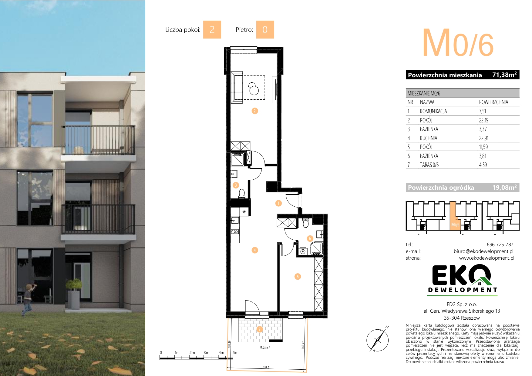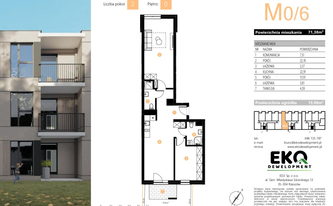 Mieszkanie znajduje się na parterze (oznaczenie 0/6), co zapewnia wygodny dostęp oraz bezpośrednie wyjście na taras i do ogródka.