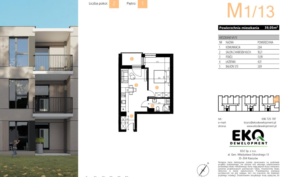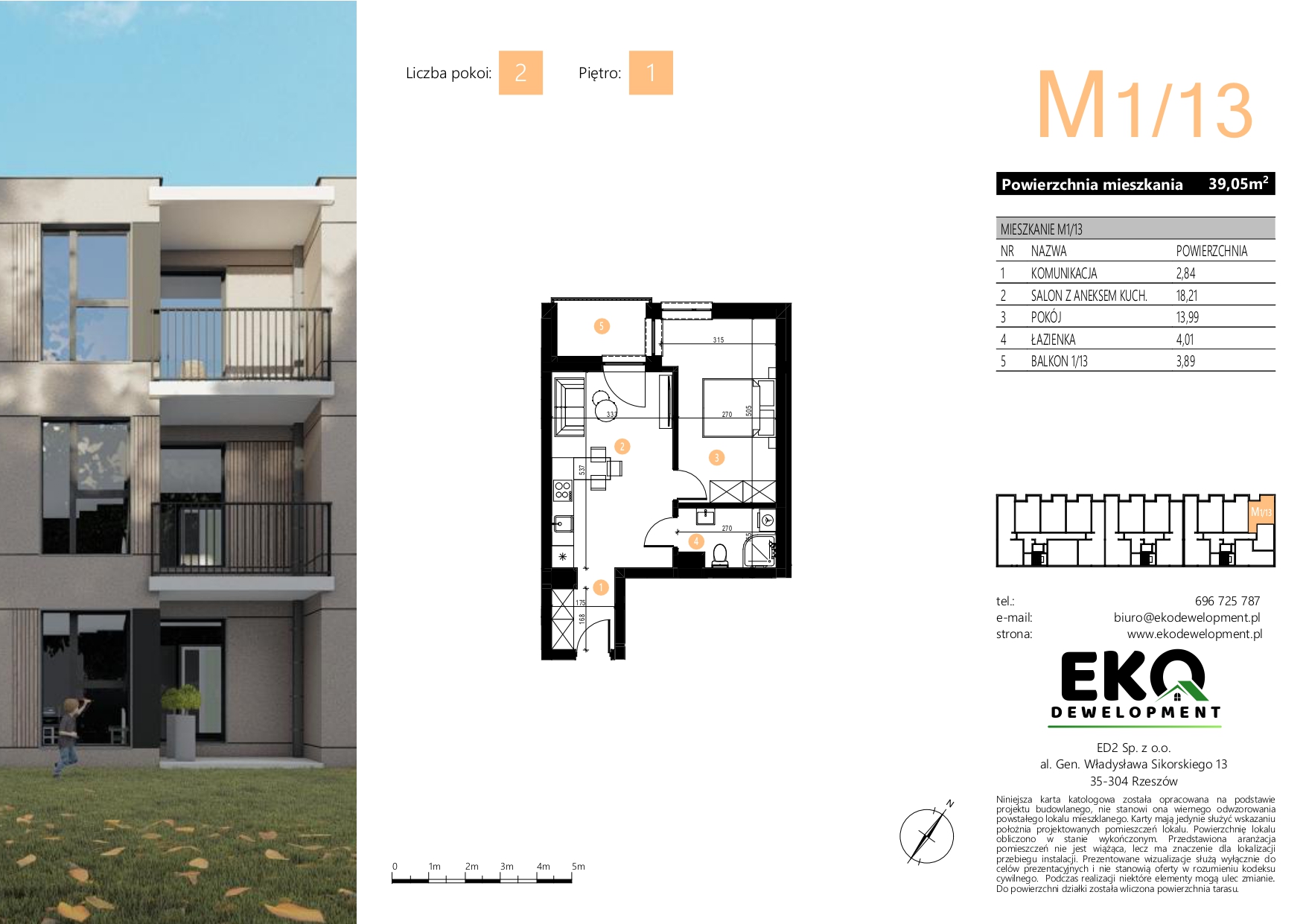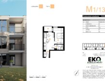Piętro 1Mieszkanie M1/13 to kompaktowy i bardzo ustawny lokal o łącznej powierzchni użytkowej 39,05 m². Jest to klasyczny przykład nowoczesnego mieszkania dwupokojowego, które maksymalnie wykorzystuje dostępny metraż.